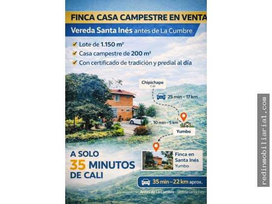 Se vende hermosa finca campestre ubicada en la vereda Santa Inés en Yumbo, en un entorno natural rodeado de tranquilidad, aire puro y paisajes espectaculares. Ideal para quienes desean vivir en el campo sin alejarse de la ciudad.